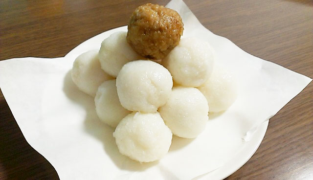 (米を日干ししすぎて普通に食べる事が出来なくなった)ご飯をすりつぶして丸めて作った物です。