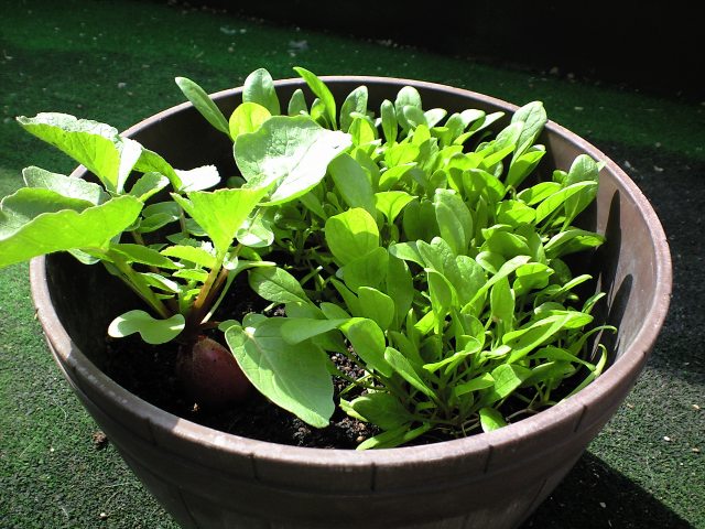 家庭菜園のラディッシュ(手前)がだいぶ育ったので、いよいよ収穫。
