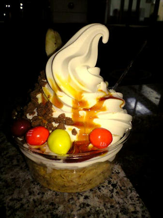 さらにさらに、マーブルチョコとチョコクランチ、バナナチップスとチョコソースがセルフでかけられます。