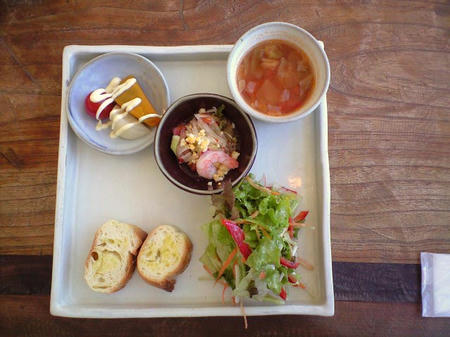 トマトスープ、サラダ、カボチャとカブとトマトのマヨネーズかけ、エビのマリネ、パン……だったかな?
