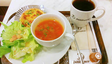 スープ、サラダ、コーヒー、キッシュのセットです。